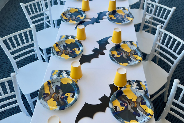 Kid size table with chiavari chairs and a ball piit